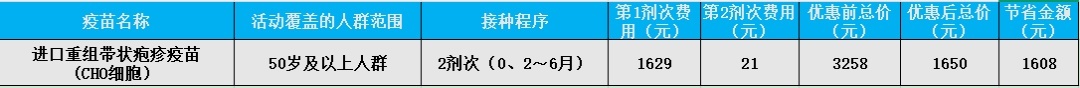 进口带状疱疹疫苗全程接种2剂,按0、2~6月程序完成接种,享受第2剂次疫苗免费,即可减免1608元。