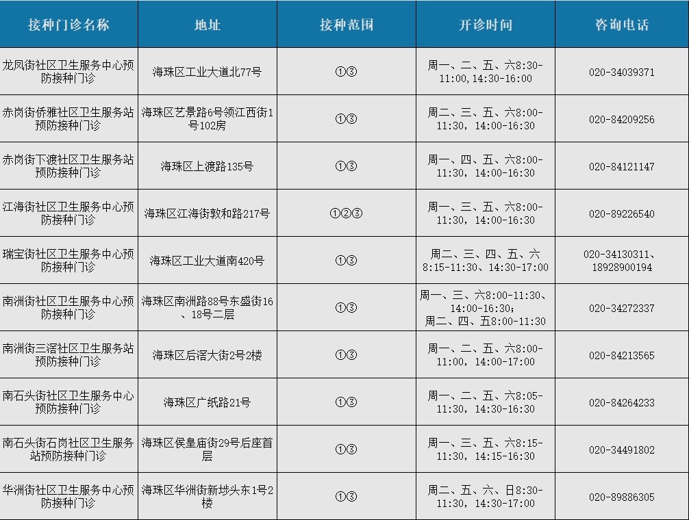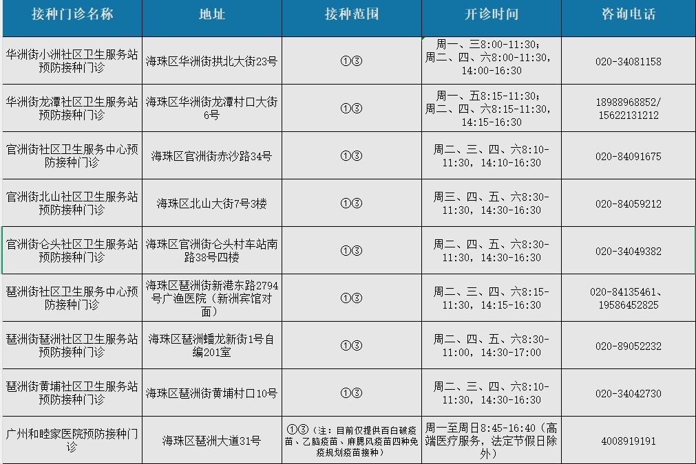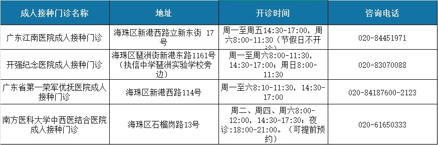 海珠区接种门诊信息: